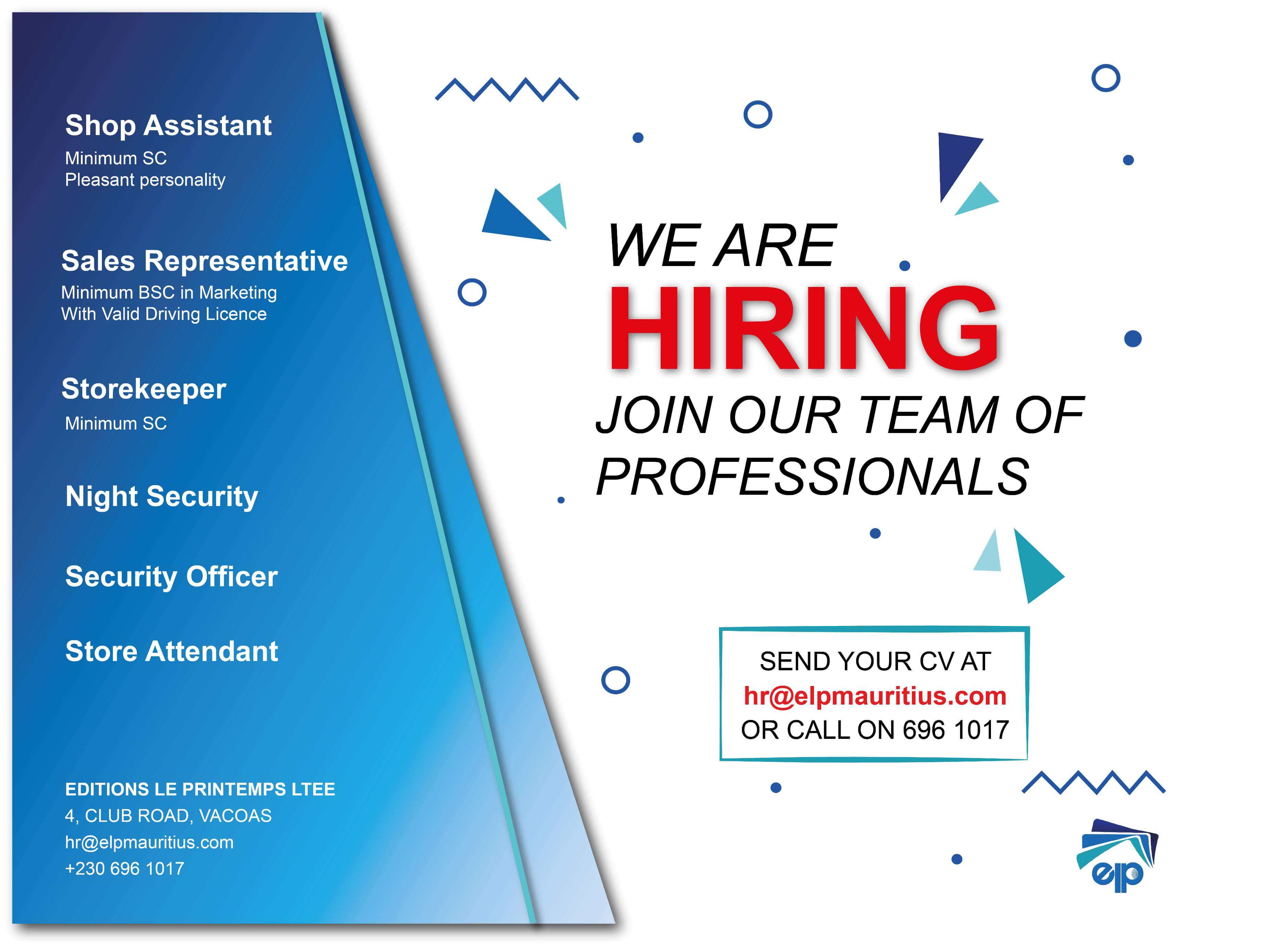 SEND YOUR CV ON [email protected] OR CALL ON 696 1017